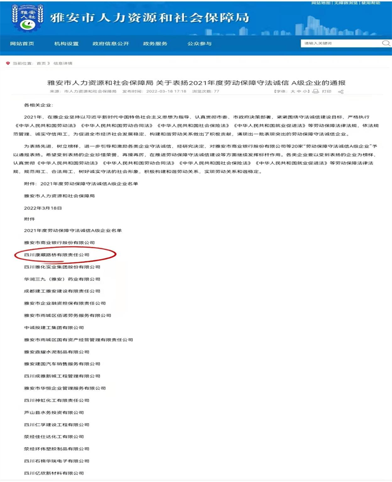 近期,根据《雅安市人力资源和社会保障局关于表扬2021年度劳动保障守法诚信 A级企业的通报》,雅安交通建设(集团)有限责任公司下属四川康藏路桥有限责任公司荣获2021年度劳动保障守法诚信 A级企业,名列我市“诚信红榜”。
