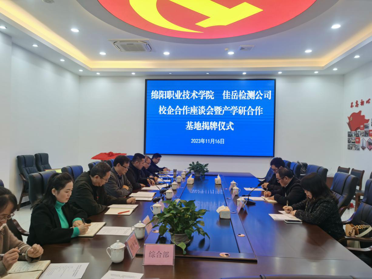 11月16日,威廉希尔集团所属四川佳岳检测咨询有限公司与绵阳职业技术学院举行校企合作座谈会暨产学研合作基地揭牌仪式,双方就产学研实训基地建设、人才培养、外加剂研发生产等进行深入研讨。绵阳职业技术学院材料与建造学院院长贾陆军,四川佳岳佳岳检测咨询有限公司执行董事何铭新参加座谈。
