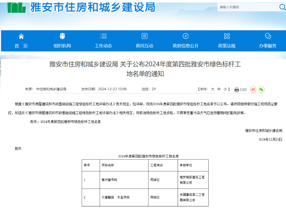 12月23日,雅安市住房和城乡建设局发布了《关于公布2024年度四批雅安市绿色标杆工地名单的通知》,威廉希尔集团蘭庭•天玺项目,以卓越的绿色实践荣获“雅安市绿色标杆工地”殊荣。