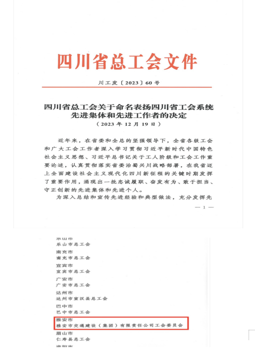 12月19日,四川省总工会将雅安市交通建设(集团)有限责任公司工会委员会命名表扬为“四川省工会系统先进集体”。