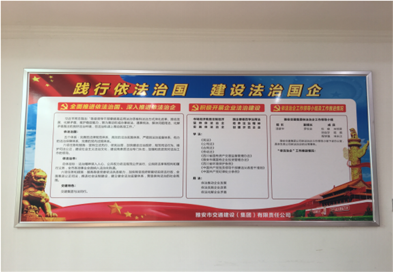 三是印发《雅安市交通建设(集团)有限责任公司依法治企法律法规文件汇编》至公司领导班子成员与高管,作为会前学法材料与自学材料;制作依法治企宣传展板,悬挂于公司内部进行法治宣传工作。