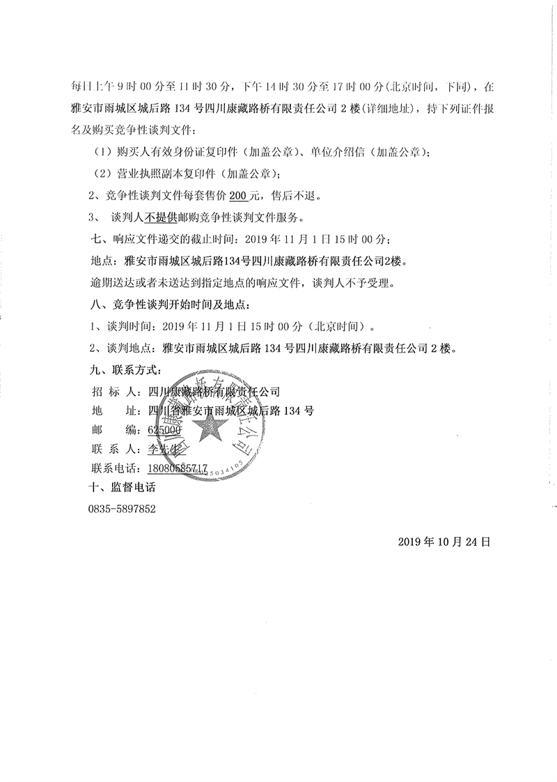 四川康藏路桥有限责任公司省道104线草坝至姚桥段改建工程项目部驻地板房采购竞争性谈判公告