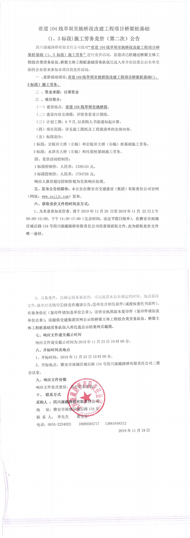 四川康藏路桥有限责任公司省道104线草坝至姚桥段改建工程项目桥梁桩基础(1、3标段)施工劳务竞价(第二次)公告