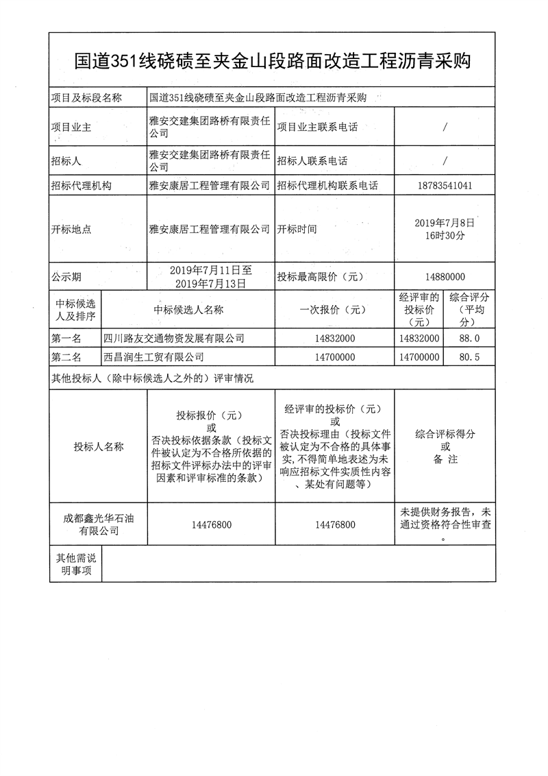 威廉希尔集团路桥有限责任公司国道351线硗碛至夹金山段路面改造工程沥青采购公开招标结果公示