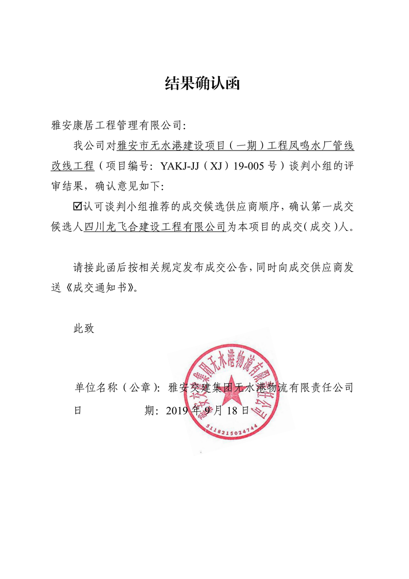 威廉希尔集团无水港物流有限责任公司雅安市无水港建设项目(一期)工程凤鸣水厂管线改线工程竞争性谈判结果公示