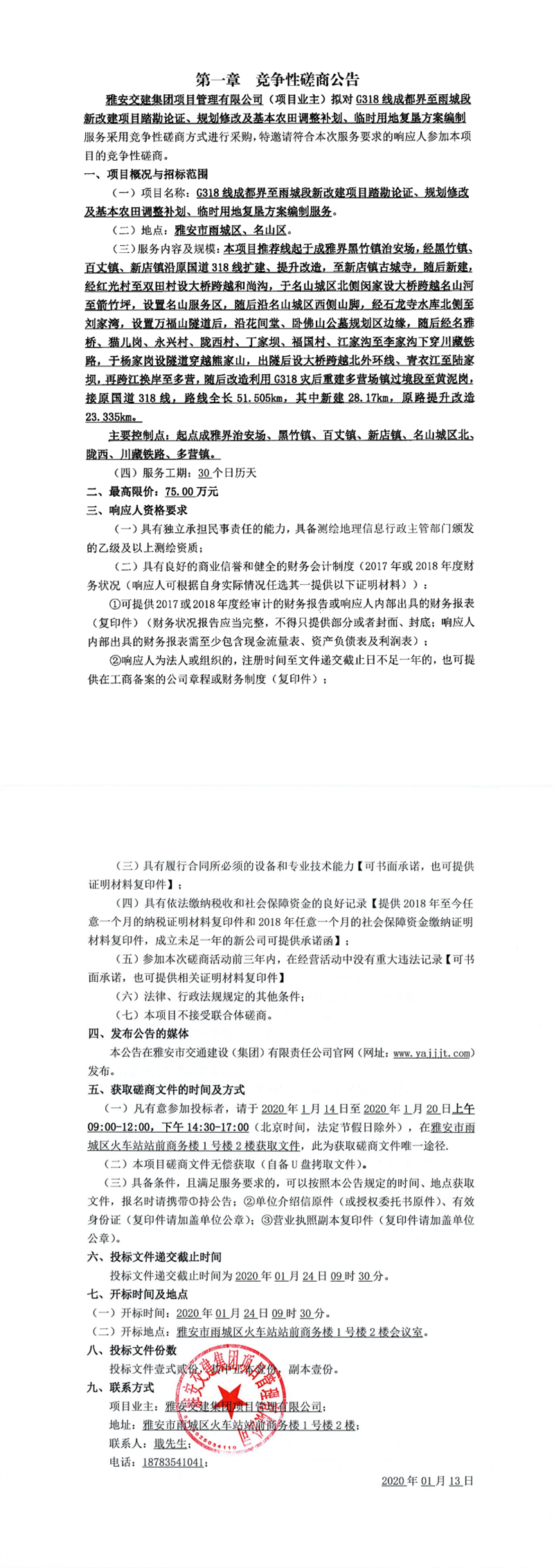 威廉希尔集团项目管理有限公司G318线成都界至雨城段新改建项目踏勘论证、规划修改及基本农田调整补划、临地用地复垦方案编制服务竞争性磋商公告