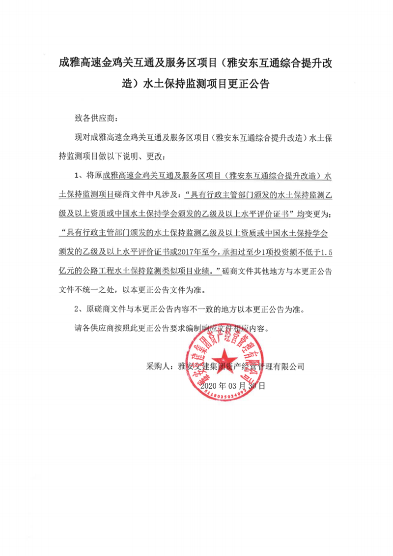 威廉希尔集团资产经营管理有限公司成雅高速金鸡关互通及服务区项目(雅安东互通综合提升改造)水土保持监测项目更正公告