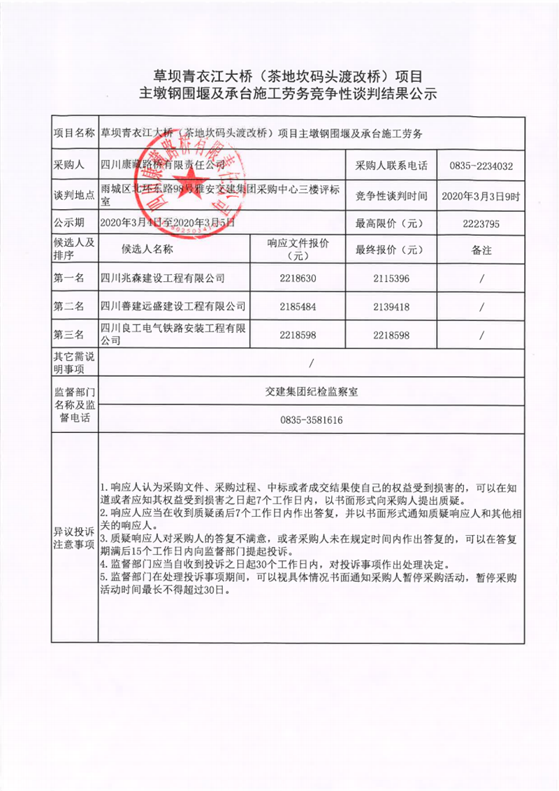 四川康藏路桥有限责任公司草坝青衣江大桥(茶地坎码头渡改桥)项目主墩钢围堰及承台施工劳务竞争性谈判结果公示