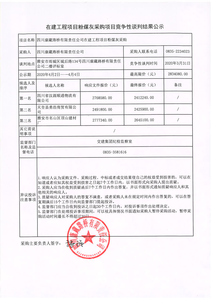 四川康藏路桥有限责任公司在建工程项目粉煤灰采购项目竞争性谈判结果公示