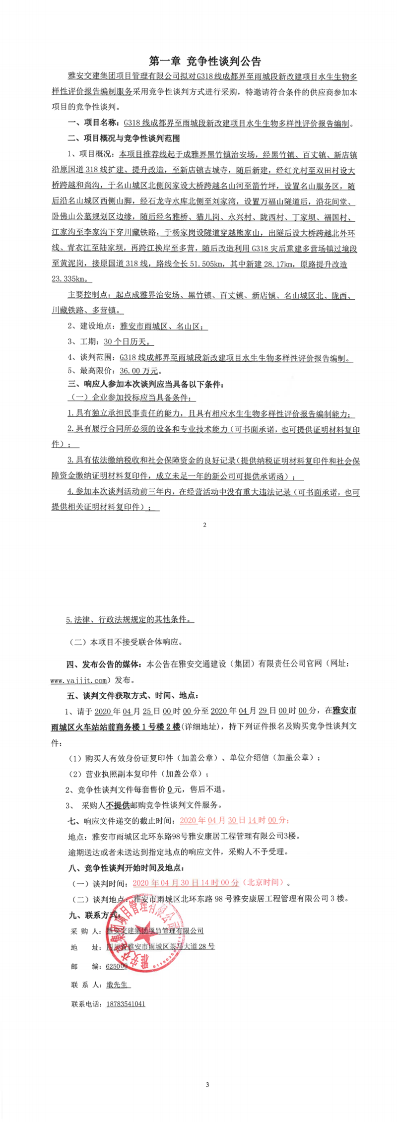 威廉希尔集团项目管理有限公司G318线成都界至雨城段新改建项目水生生物多样性影响评价编制竞争性谈判公告