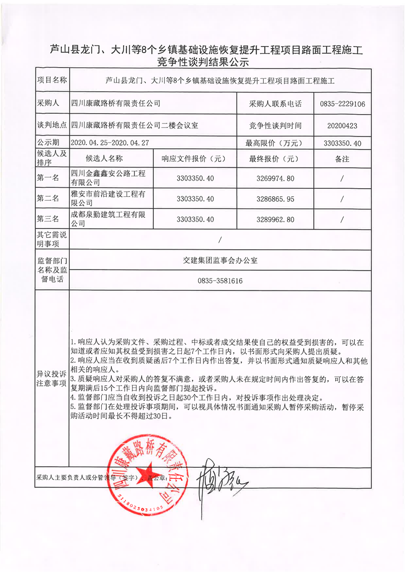 四川康藏路桥有限责任公司芦山县龙门、大川等8个乡镇基础设施恢复提升工程项目路面工程施工竞争性谈判结果公示