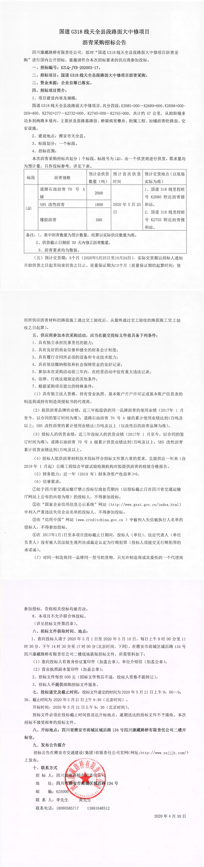 四川康藏路桥有限责任公司国道G318线天全县段路面大中修项目沥青采购招标公告