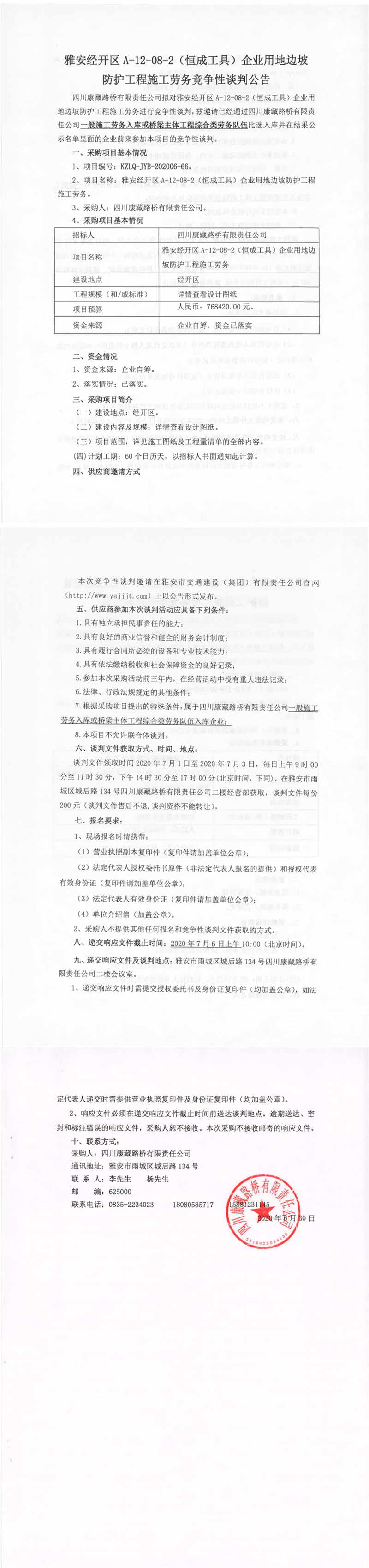四川康藏路桥有限责任公司雅安经开区A-12-08-2(恒成工具)企业用地边坡防护工程施工劳务竞争性谈判公告