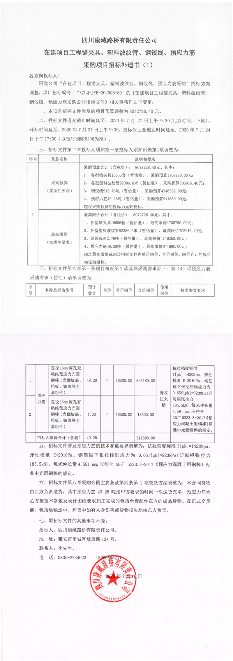 四川康藏路桥有限责任公司在建项目工程锚夹具、塑料波纹管、钢铰线、预应力筋采购项目招标补遗书(1)