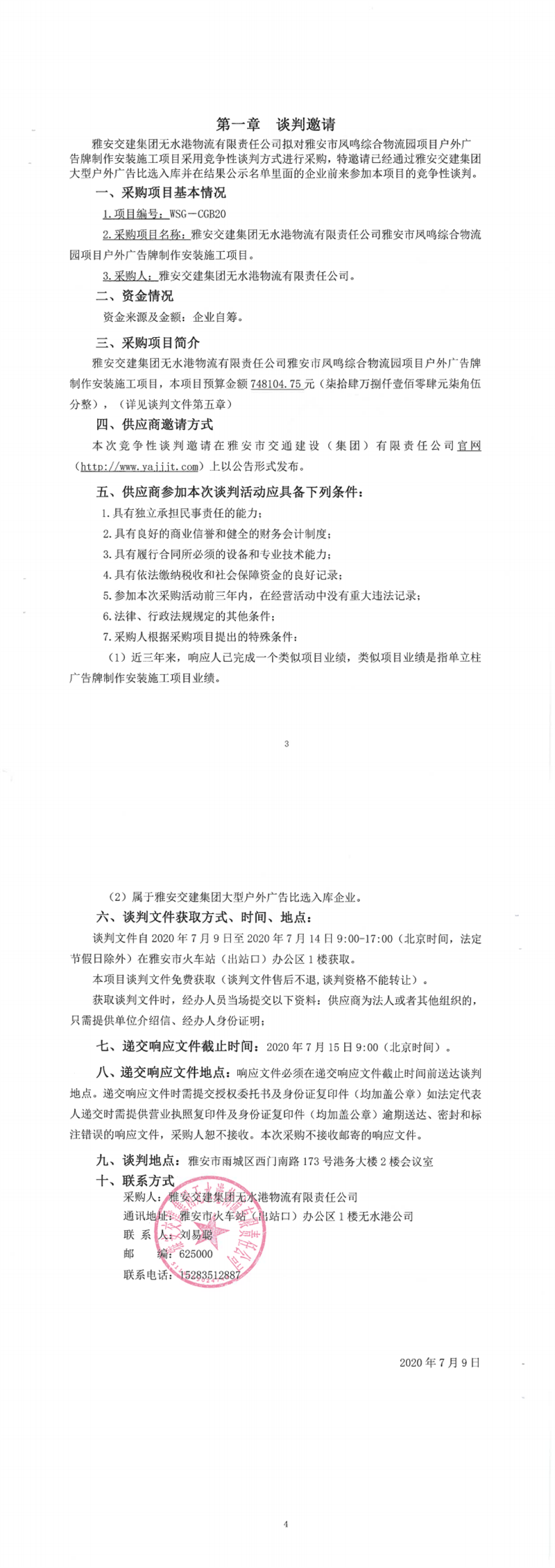 威廉希尔集团无水港物流有限责任公司雅安市凤鸣综合物流园项目户外广告牌制作安装施工项目竞争性谈判公告