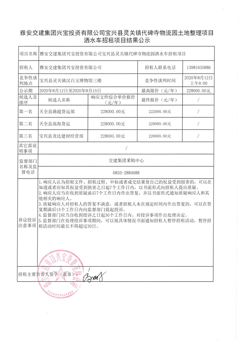 威廉希尔集团兴宝投资有限公司宝兴县灵关镇代碑寺物流园洒水车招租项目结果公示