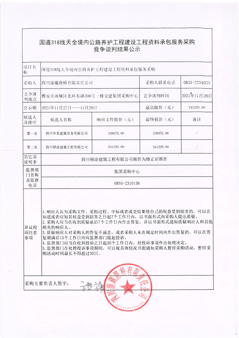 四川康藏路桥有限责任公司国道318线天全境内公路养护工程建设工程资料承包服务采购竞争谈判结果公示