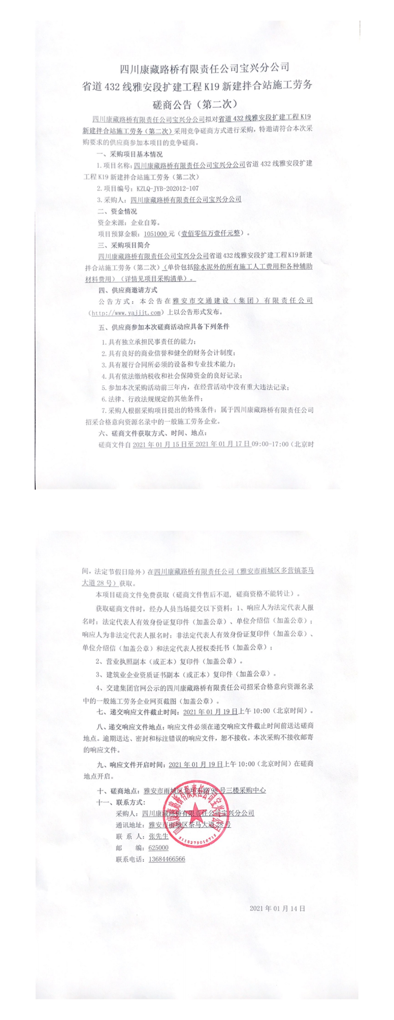 四川康藏路桥有限责任公司宝兴分公司省道432线雅安段扩建工程K19新建拌合站施工劳务磋商公告(第二次)