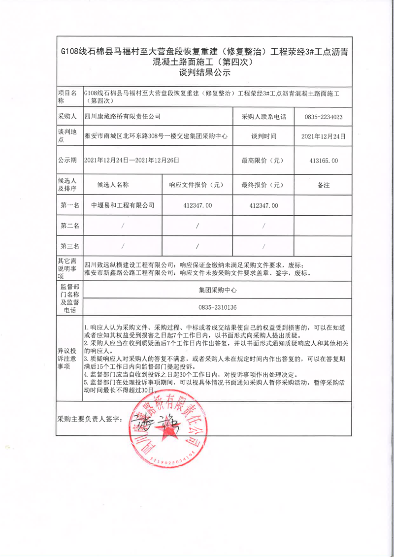 四川康藏路桥有限责任公司G108线石棉县马福村至大营盘段恢复重建(修复整治)工程荥经3#工点沥青混凝土路面施工(第四次)谈判结果公示