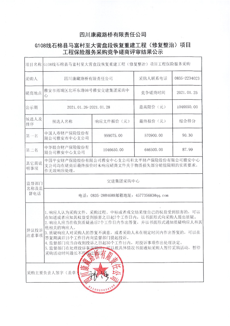 四川康藏路桥有限责任公司G108线石棉县马富村至大营盘段恢复重建工程(修复整治)项目工程保险服务采购竞争磋商评审结果公示