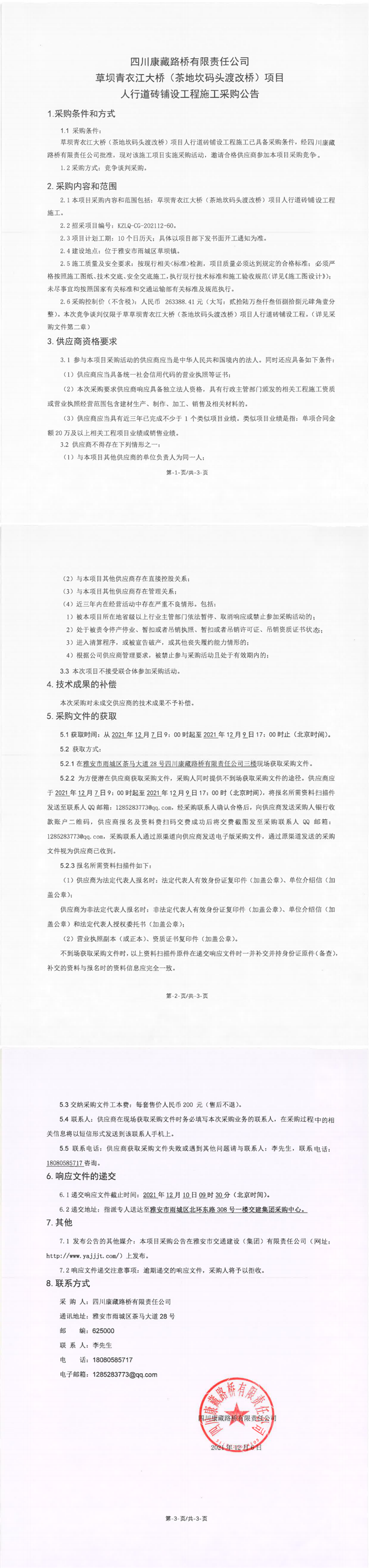 四川康藏路桥有限责任公司草坝青衣江大桥(茶地坎码头渡改桥)项目人行道砖铺设工程施工采购公告