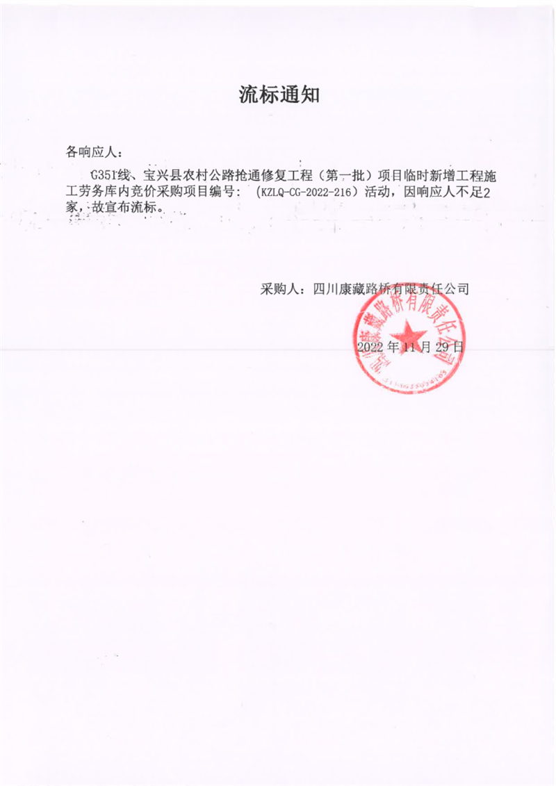 四川康藏路桥有限责任公司G351线、宝兴县农村公路抢通修复工程(第一批)项目临时新增工程施工劳务库内竞价采购流标通知