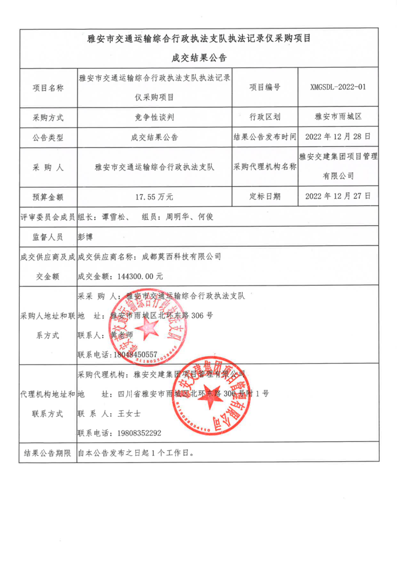 威廉希尔集团项目管理有限公司雅安市交通运输综合行政执法支队执法记录仪采购项目成交结果公告
