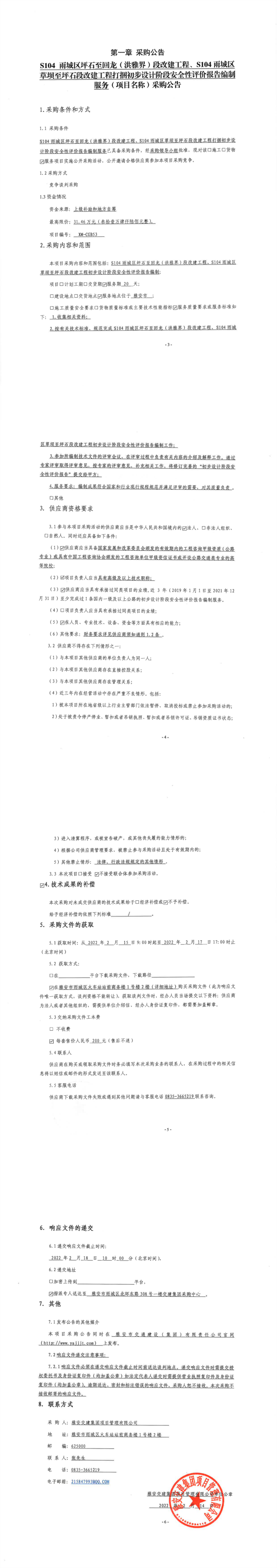 威廉希尔集团项目管理有限公司S104雨城区坪石至回龙(洪雅界)段改建工程、S104雨城区草坝至坪石段改建工程打捆初步设计阶段安全性评价报告编制服务采购公告