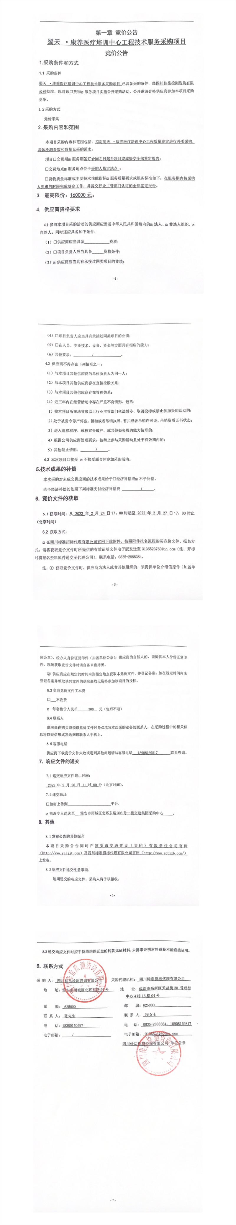 四川佳岳检测咨询有限公司蜀天.康养医疗培训中心工程技术服务采购项目竞价公告
