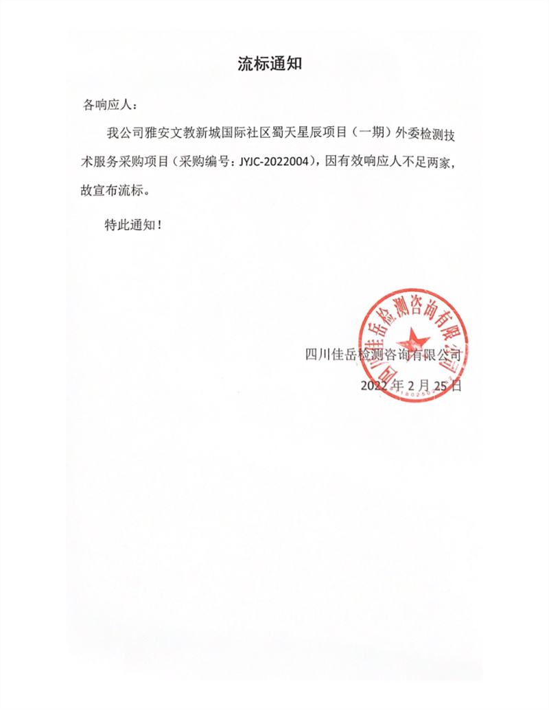 四川佳岳检测咨询有限公司雅安文教新城国际社区蜀天星辰项目(一期)外委检测服务采购项目流标通知