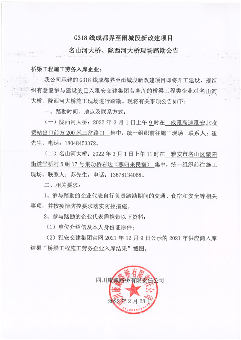 四川康藏路桥有限责任公司G318线成都界至雨城段新改建项目名山河大桥、陇西河大桥现场踏勘公告