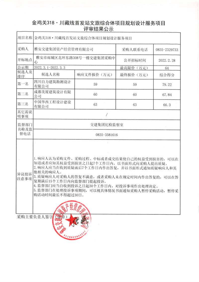 威廉希尔集团资产经营管理有限公司金鸡关318.川藏线首发站文旅综合体项目规划设计服务项目评审结果公示