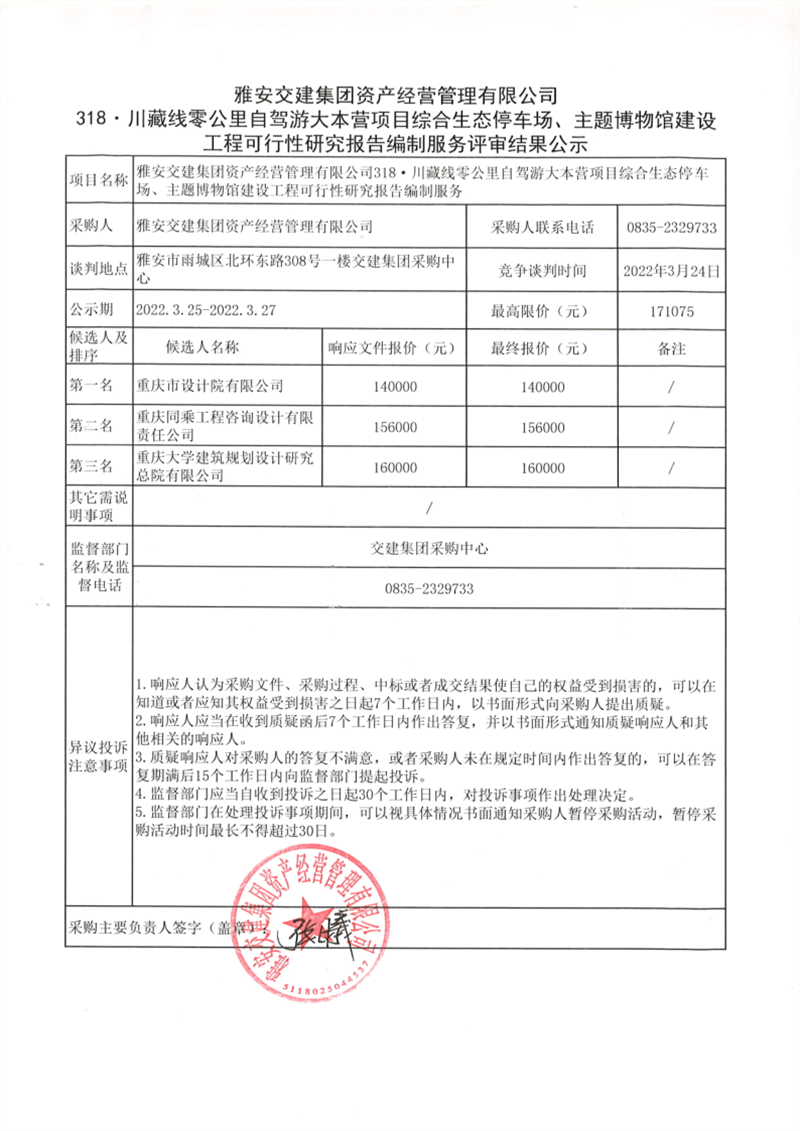 威廉希尔集团资产经营管理有限公司318.川藏线零公里自驾游大本营项目综合生态停车场、主题博物馆建设工程可行性研究报告编制服务评审结果公示