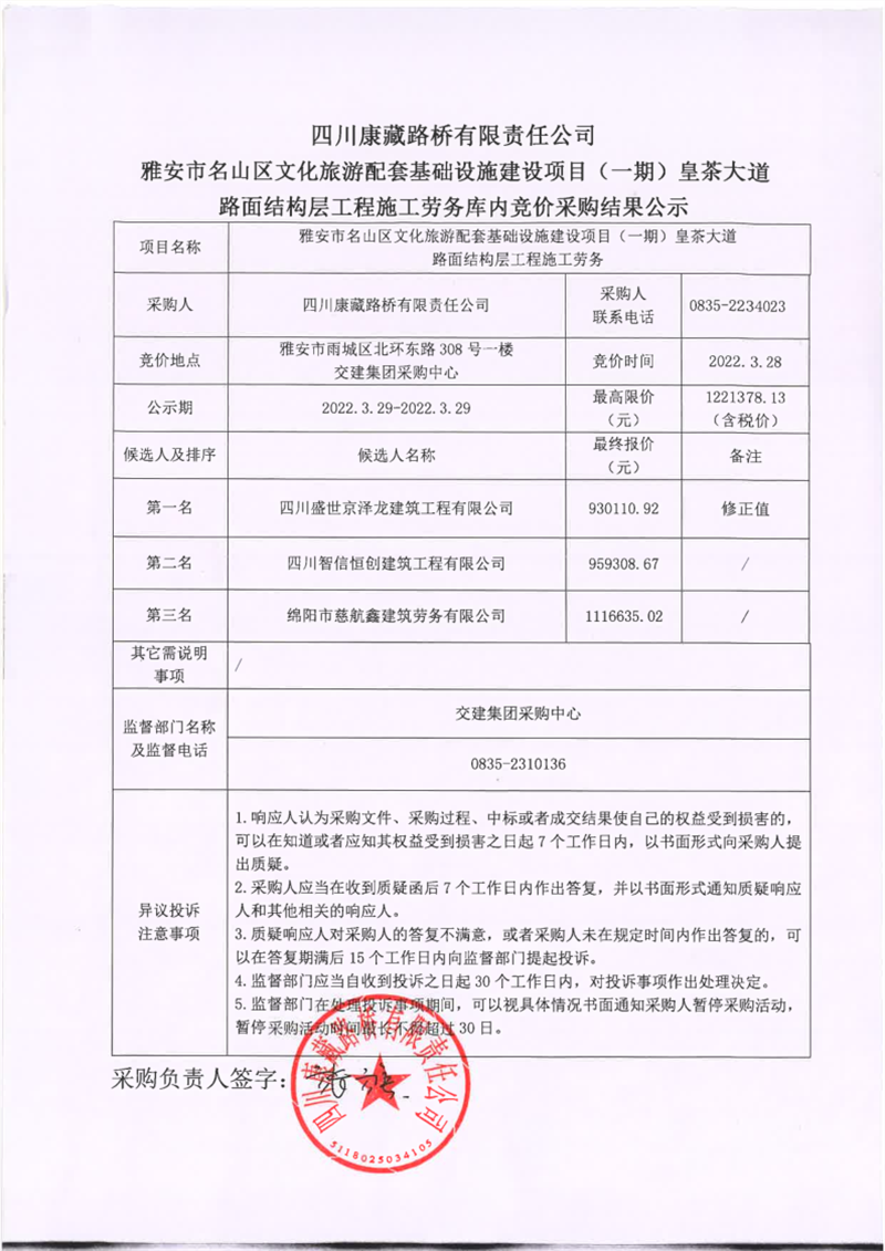 四川康藏路桥有限责任公司雅安市名山区文化旅游配套基础设施建设项目(一期)路面结构层工程施工劳务库内竞价采购结果公示