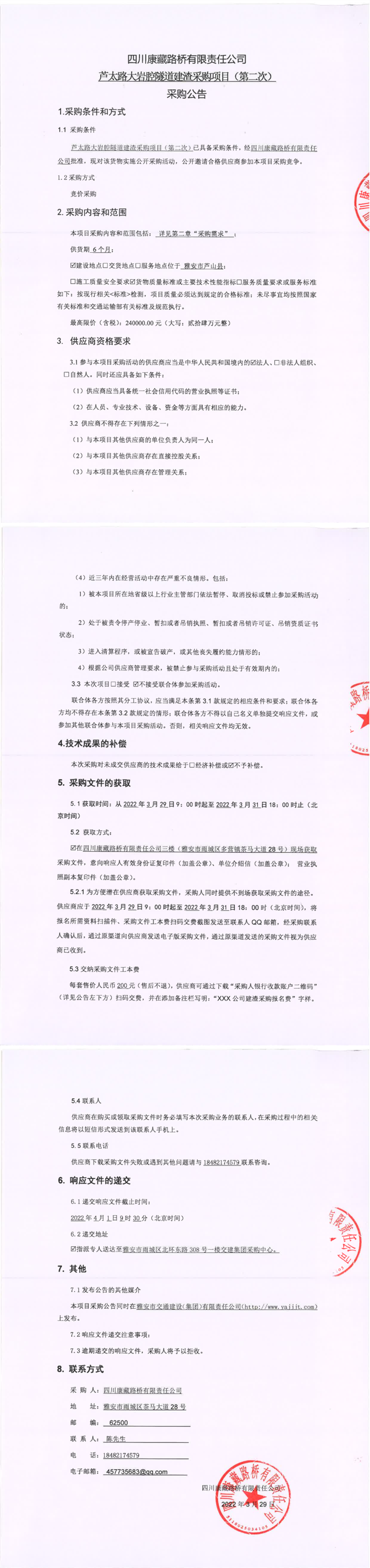 四川康藏路桥有限责任公司芦太路大岩腔隧道建渣采购项目(第二次)采购公告