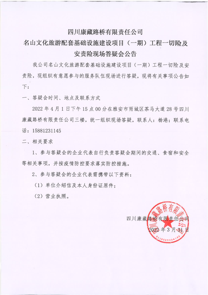 四川康藏路桥有限责任公司名山文化旅游配套基础设施建设项目(一期)工程一切险及安责险现场答疑会公告