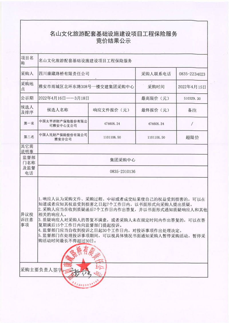 四川康藏路桥有限责任公司名山文化旅游配套基础设施建设项目工程保险服务竞价结果公示