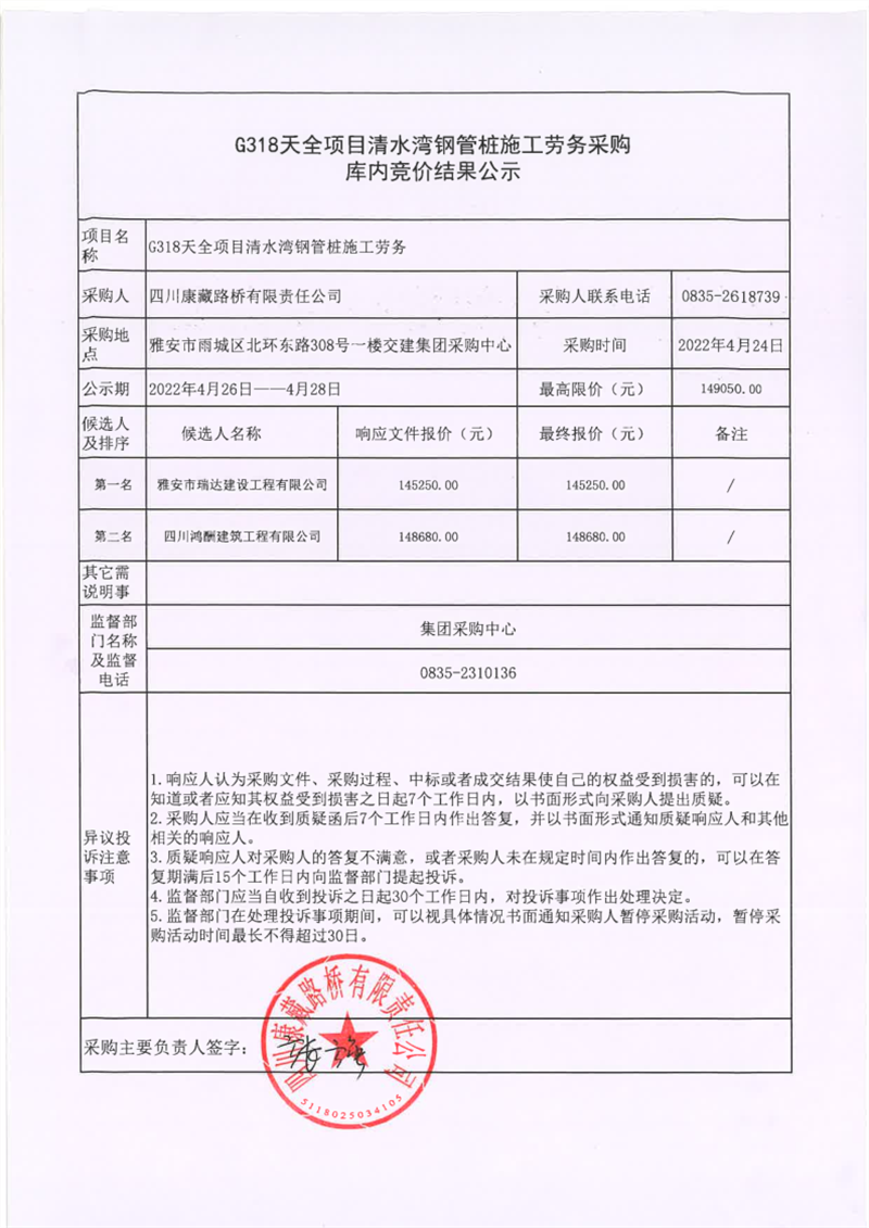 四川康藏路桥有限责任公司G318天全项目清水湾钢管桩施工劳务采购库内竞价结果公示