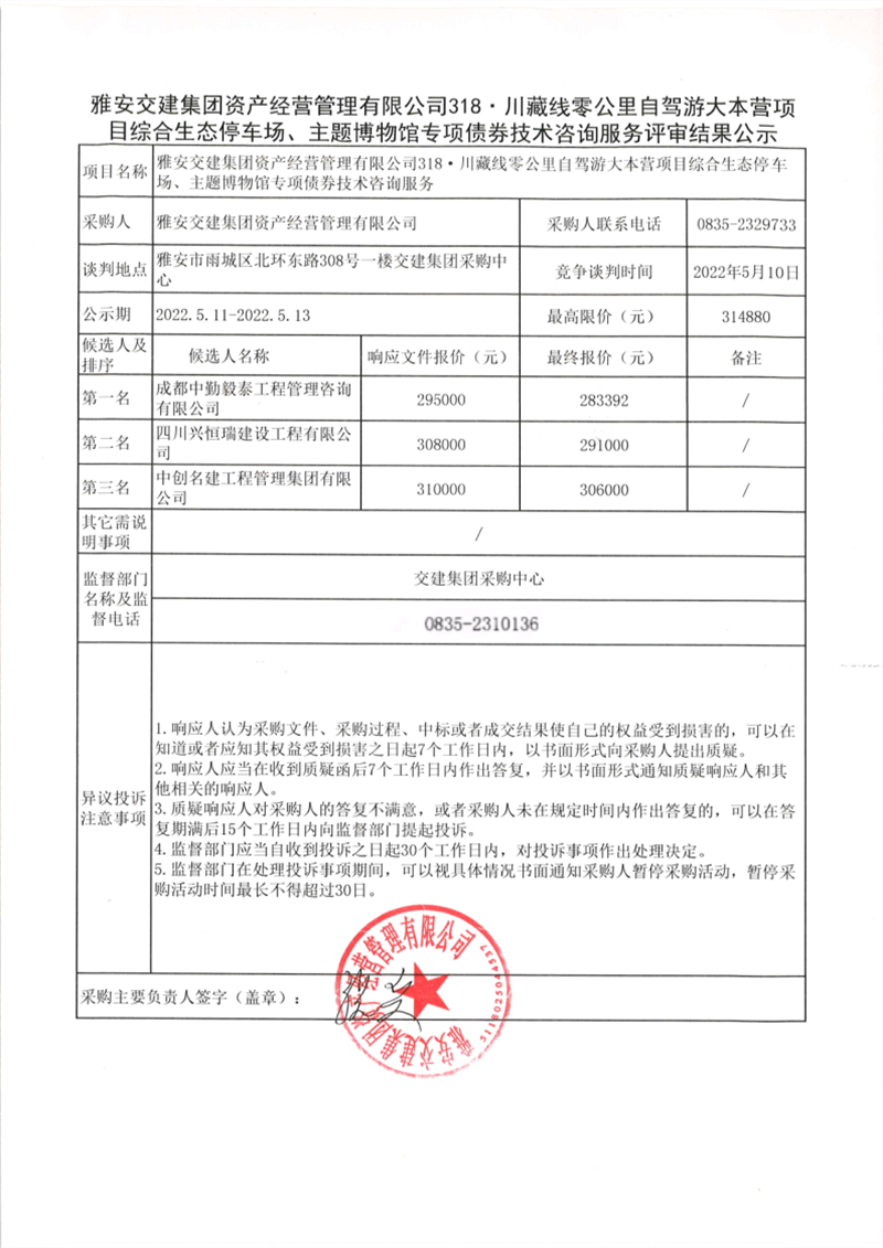 威廉希尔集团资产经营管理有限公司318·川藏线零公里自驾游大本营项目综合生态停车场、主题博物馆专项债券技术咨询服务评审结果公示
