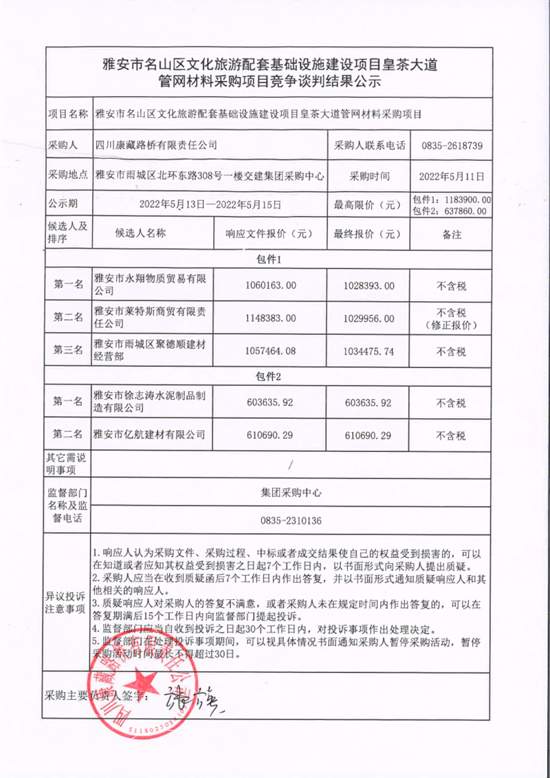 四川康藏路桥有限责任公司雅安市名山区文化旅游配套基础设施建设项目皇茶大道管网材料采购项目竞争谈判结果公示
