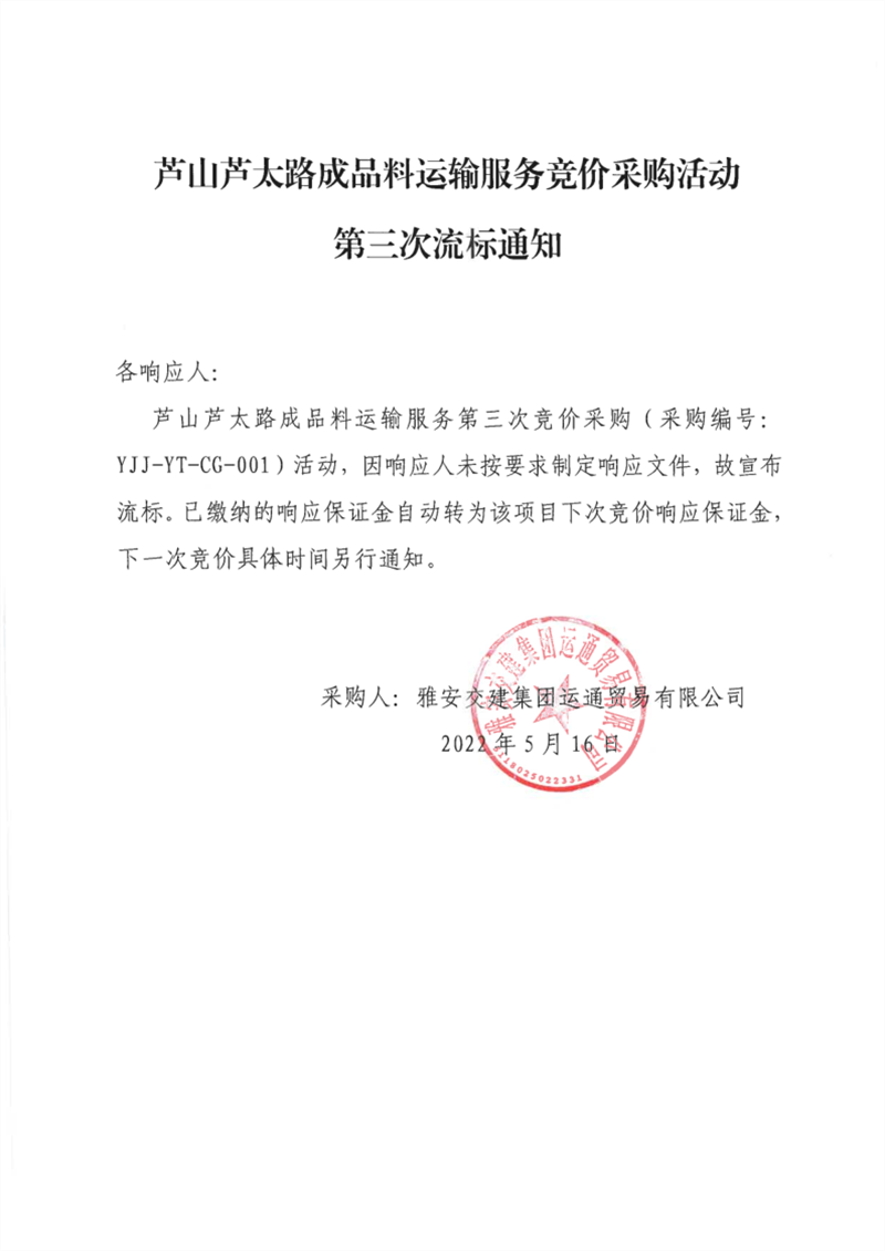 威廉希尔集团运通贸易有限公司芦山芦太路成品料运输服务竞价采购活动第三次流标通知