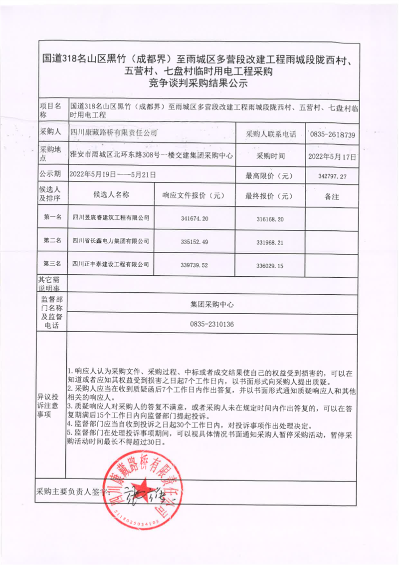 四川康藏路桥有限责任公司国道318名山区黑竹(成都界)至雨城区多营段改建工程雨城段陇西村、五营村、七盘村临时用电工程采购竞争谈判结果公示