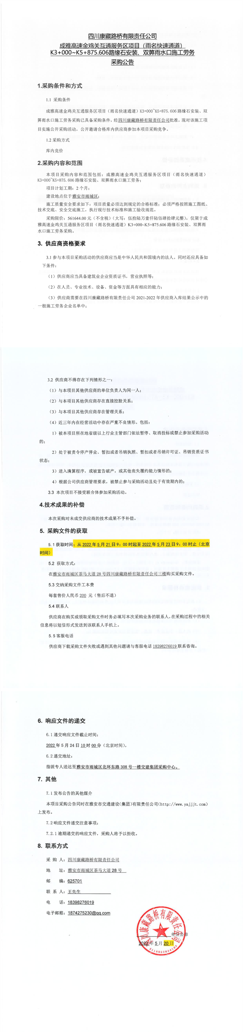 四川康藏路桥有限责任公司成雅高速金鸡关互通服务区项目(雨名快速通道)K3+000-K5+875.606路缘石安装、双箅雨水口施工劳务采购公告
