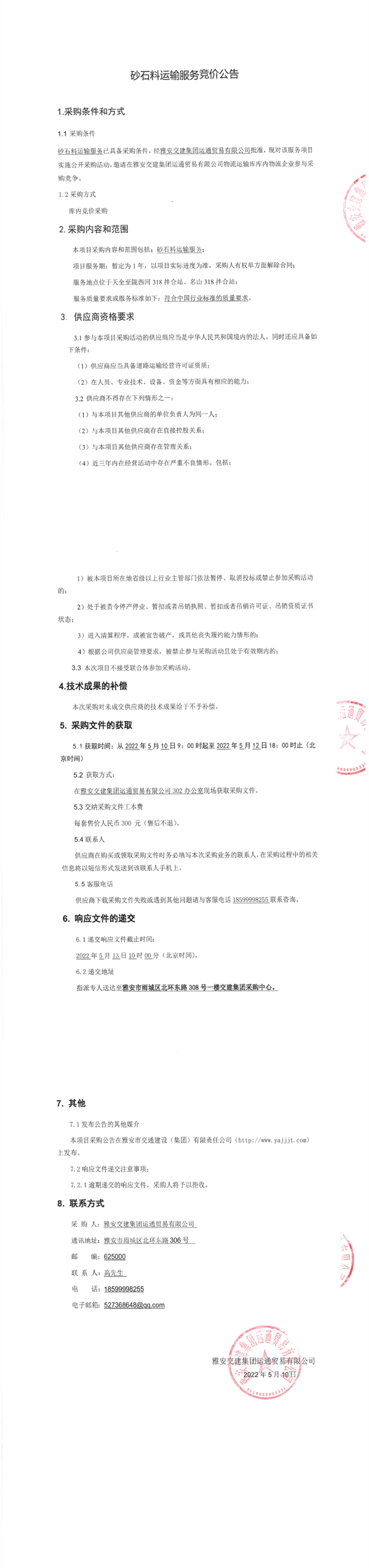 威廉希尔集团运通贸易有限公司芦山芦太路成品料运输服务竞价公告(第三次)