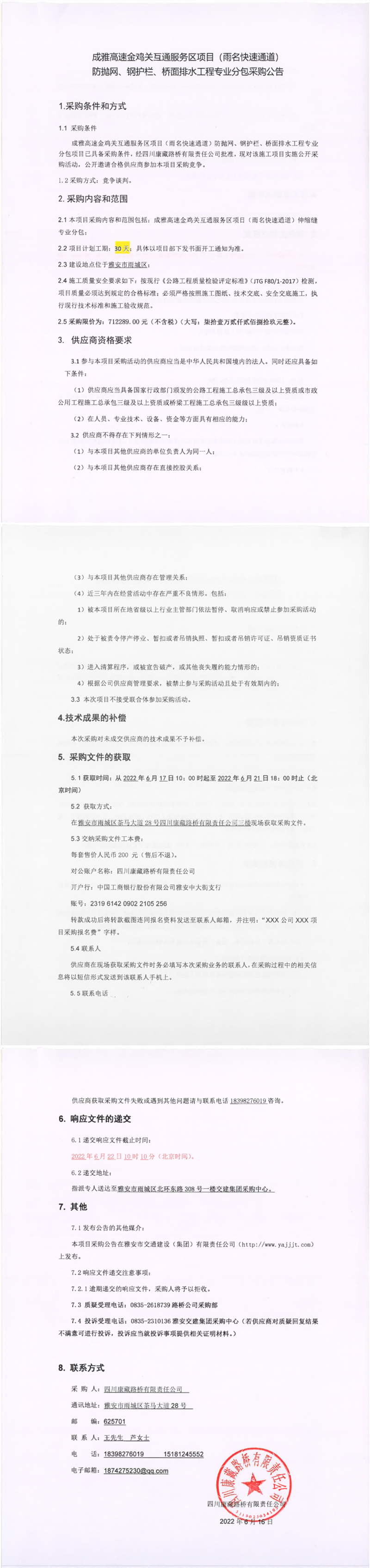 四川康藏路桥有限责任公司成雅高速金鸡关互通服务区项目(雨名快速通道)防抛网、钢护栏、桥面排水工程专业分包采购公告