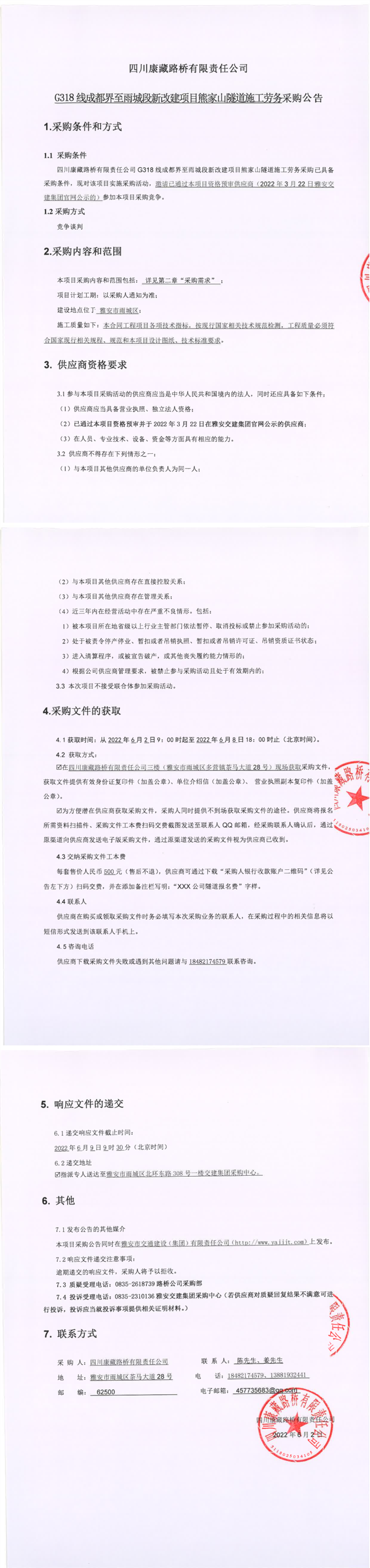 四川康藏路桥有限责任公司G318线成都界至雨城段新改建项目熊家山隧道施工劳务采购公告