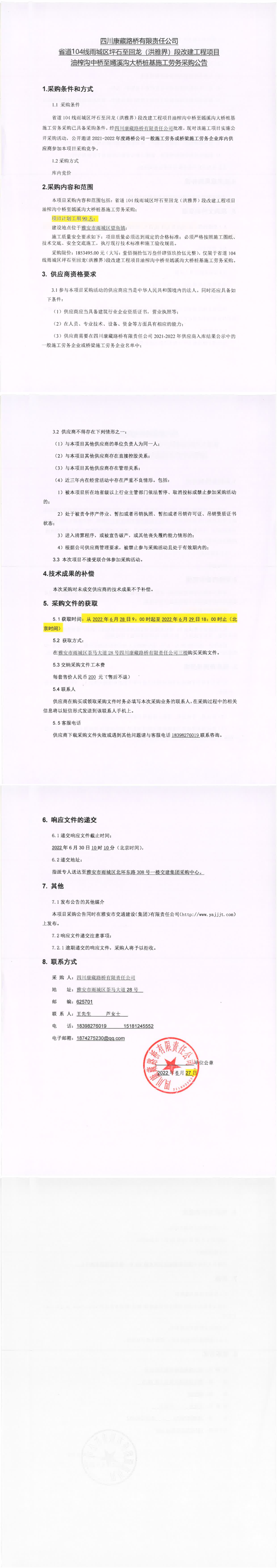 四川康藏路桥有限责任公司省道104线雨城区坪石至回龙(洪雅界)段改建工程项目钱坝大桥、望鱼大桥桩基及钢便桥工程施工劳务采购公告