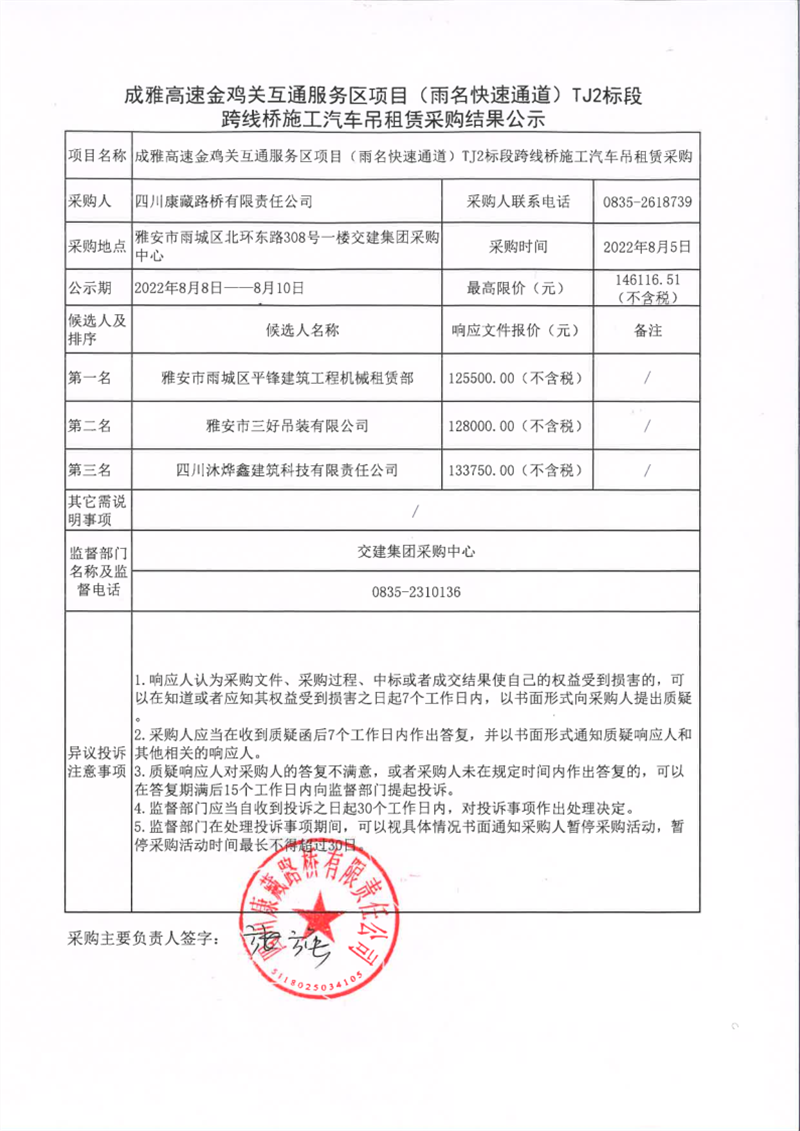 四川康藏路桥有限责任公司成雅高速金鸡关互通服务区项目(雨名快速通道)TJ2标段跨线桥施工汽车吊租赁采购结果公示