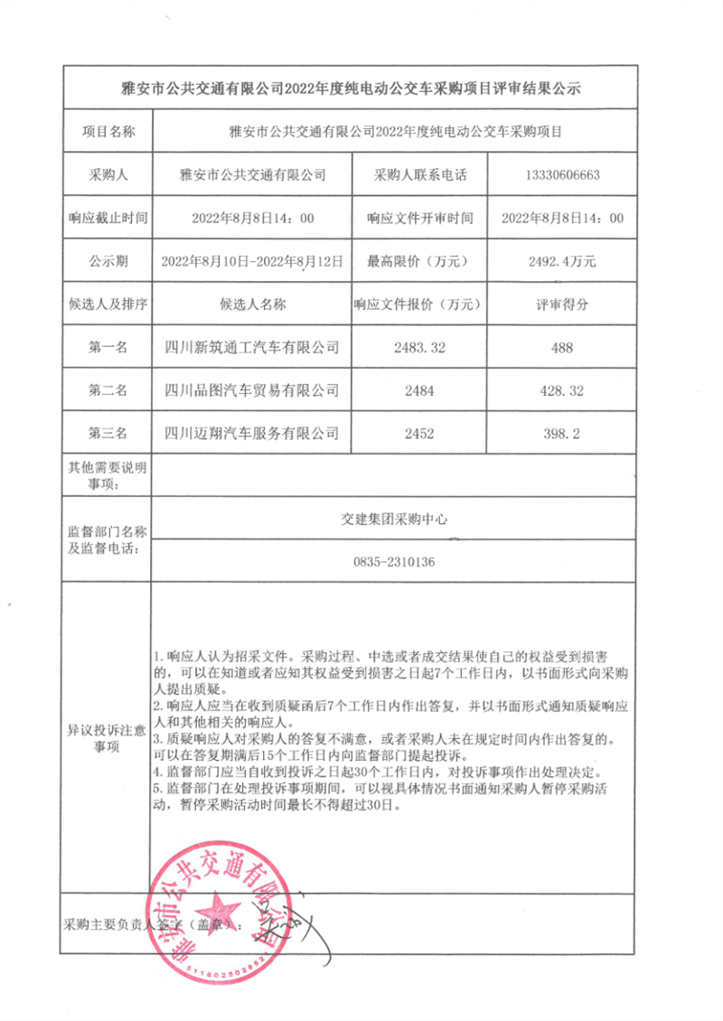 雅安市公共交通有限公司2022年度纯电动公交车采购项目评审结果公示