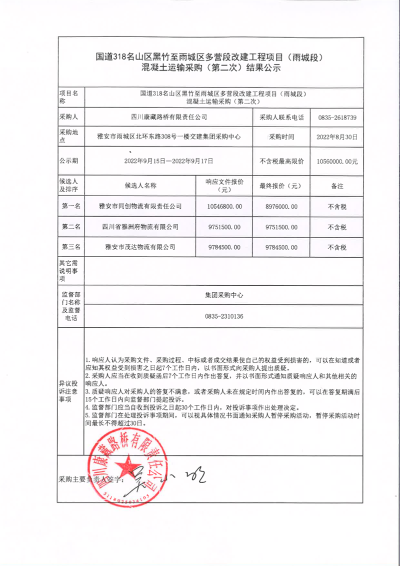 四川康藏路桥有限责任公司国道318名山区黑竹至雨城区多营段改建工程项目(雨城段)混凝土运输采购(第二次)结果公示